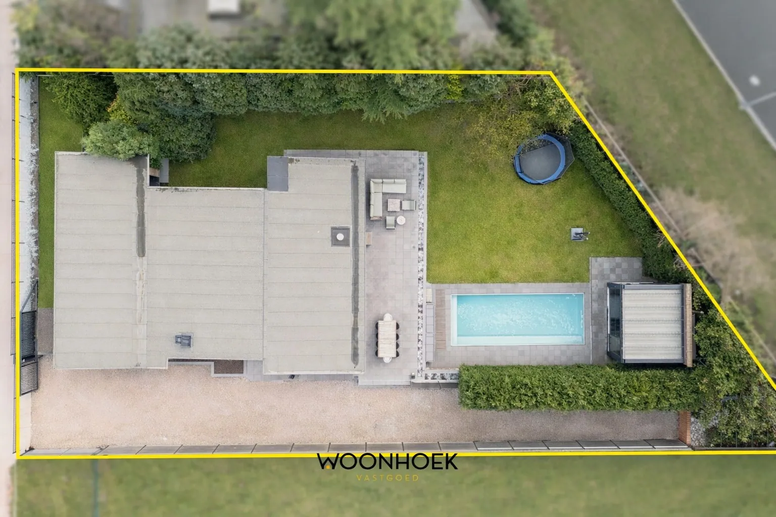 De zonnige tuin met zwembad (jetstream) & poolhouse is een verlengstuk van je leefruimte — een plek om te ontspannen, te genieten van groen en van de zon.