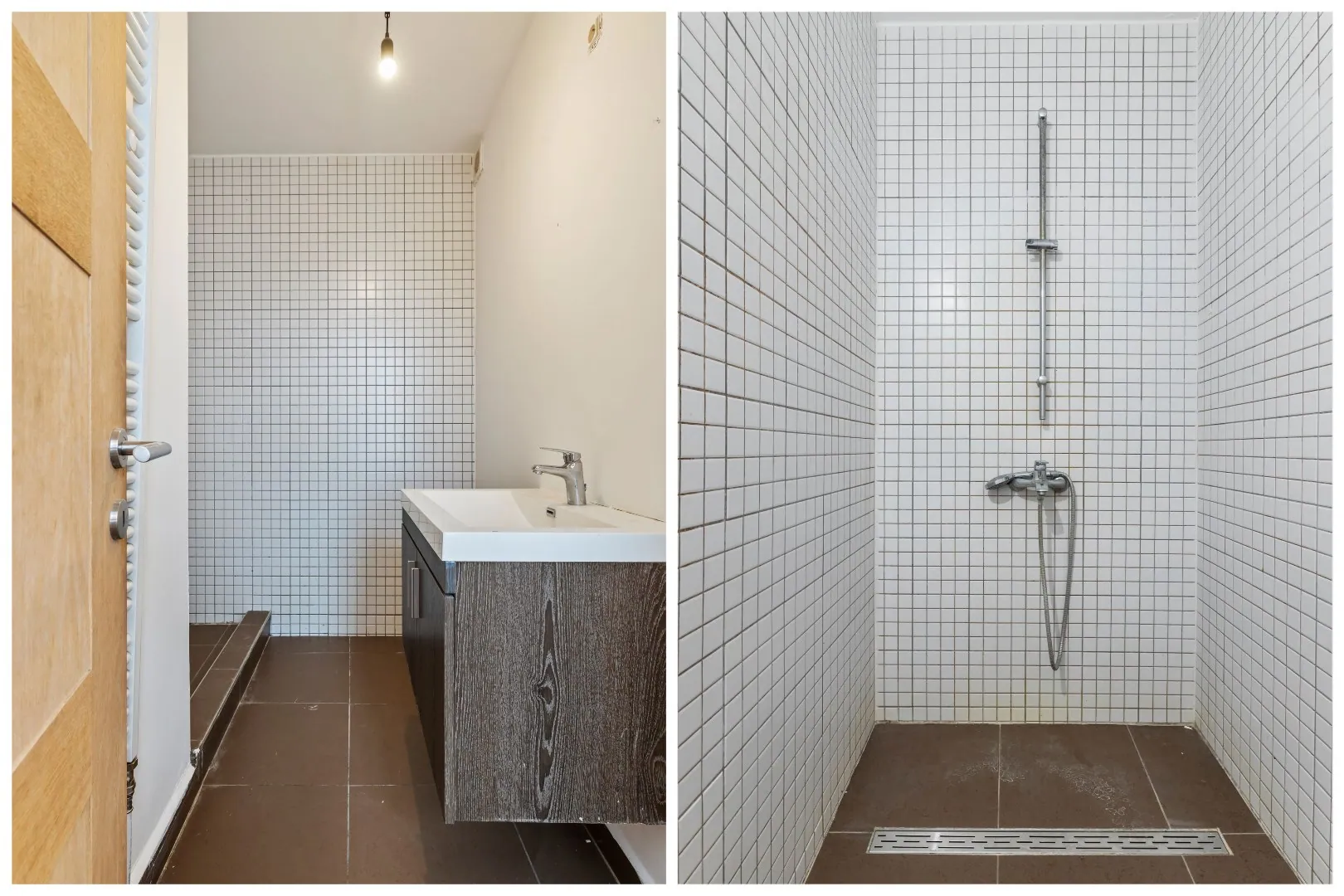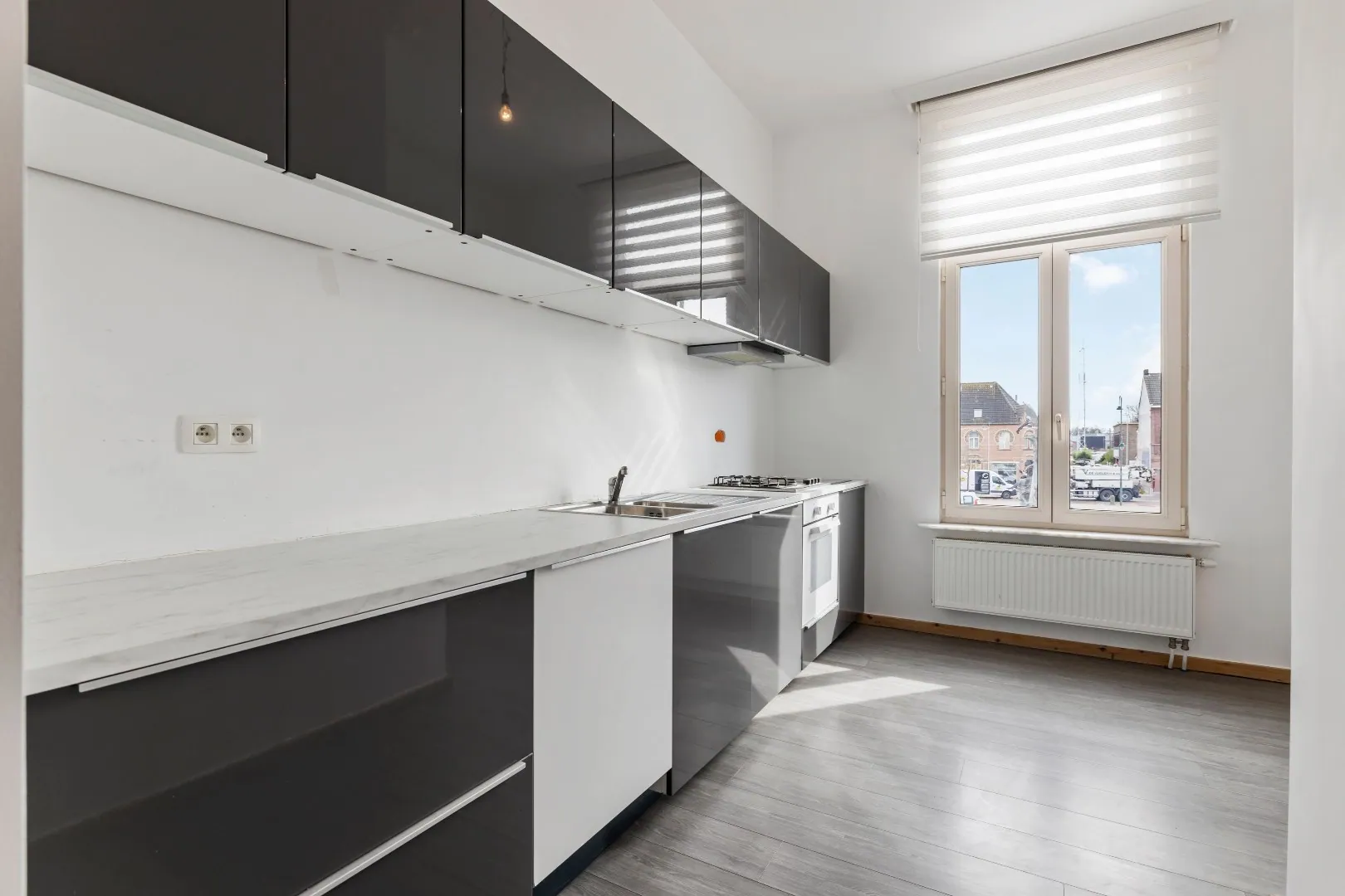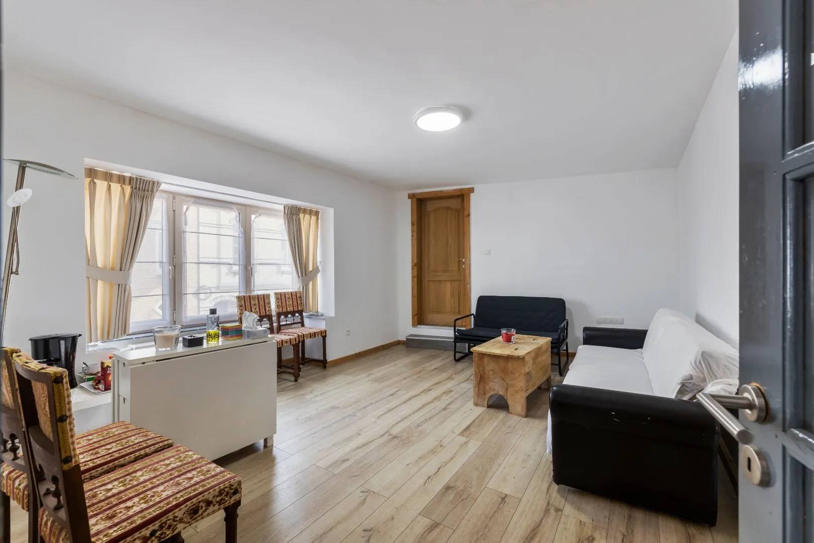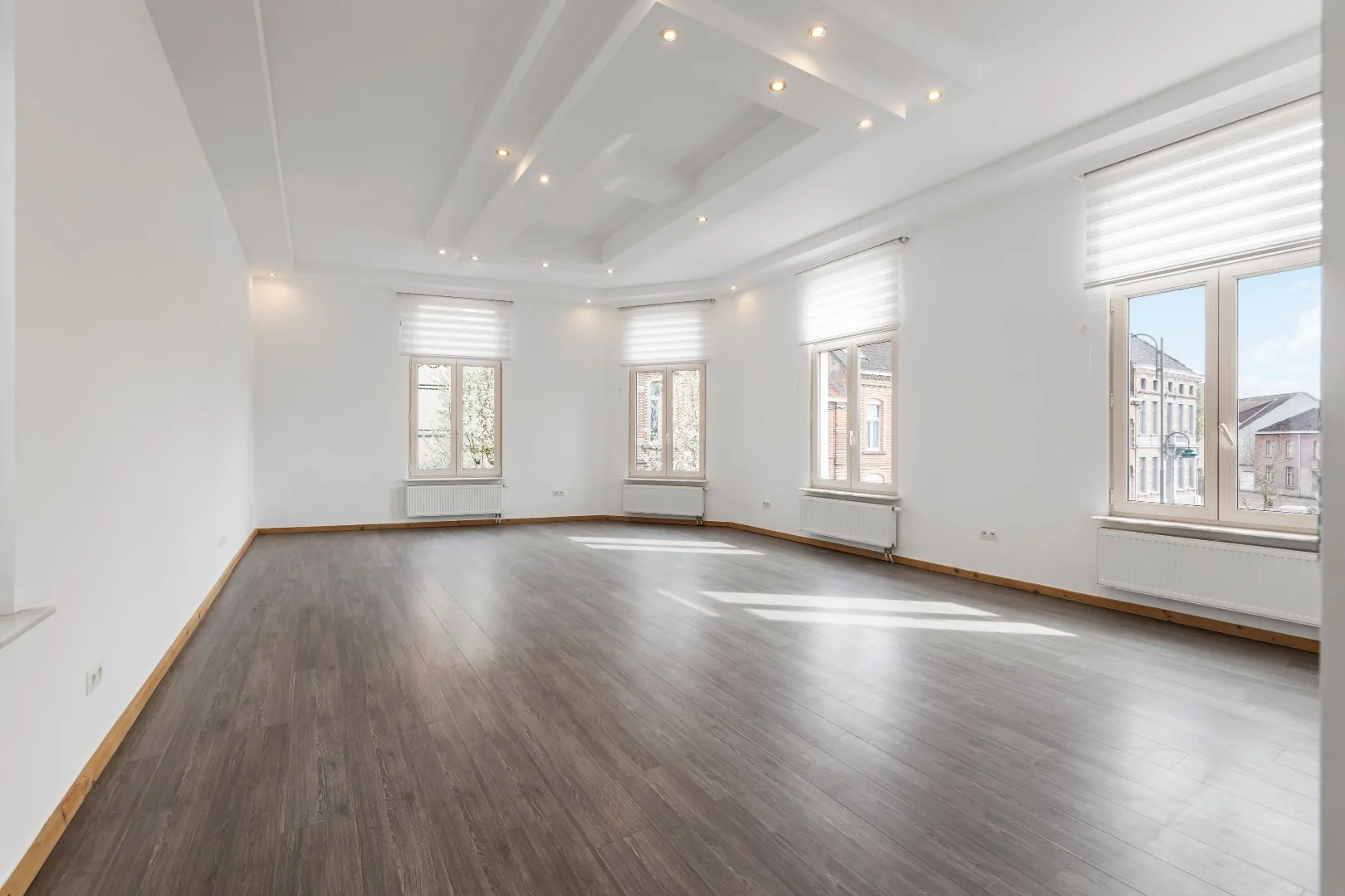 Via de linker voordeur komen we terecht in het duplex-appartement die beschikt over een aparte badkamer met douche en een zeer mooie, lichtrijke woonkamer met uitzicht over het Koning Albertplein! Het duplex appartement is ook voorzien van een zonneterras!