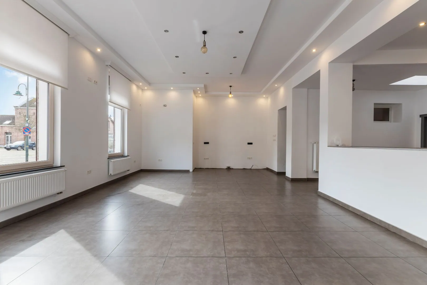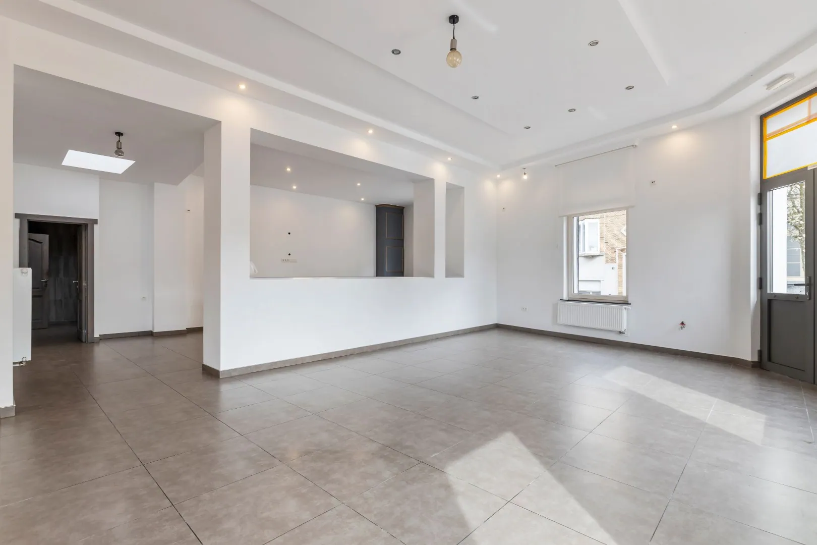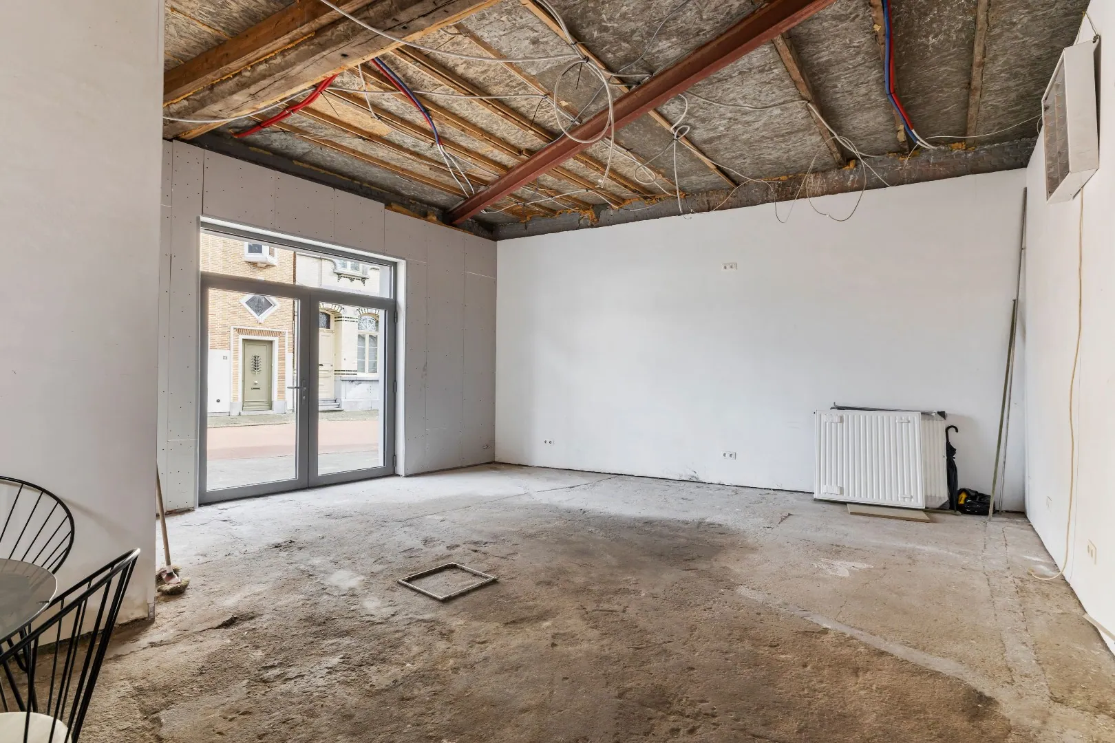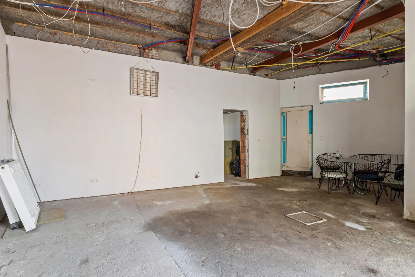 GLV: Men betreedt het handelsgelijkvloers via de aparte ingang, deze is reeds afgewerkt met een betonvloer en de nodige elektrische aansluitingen.