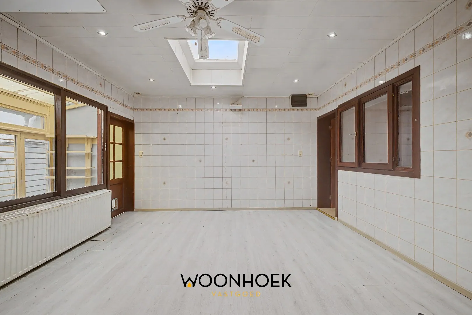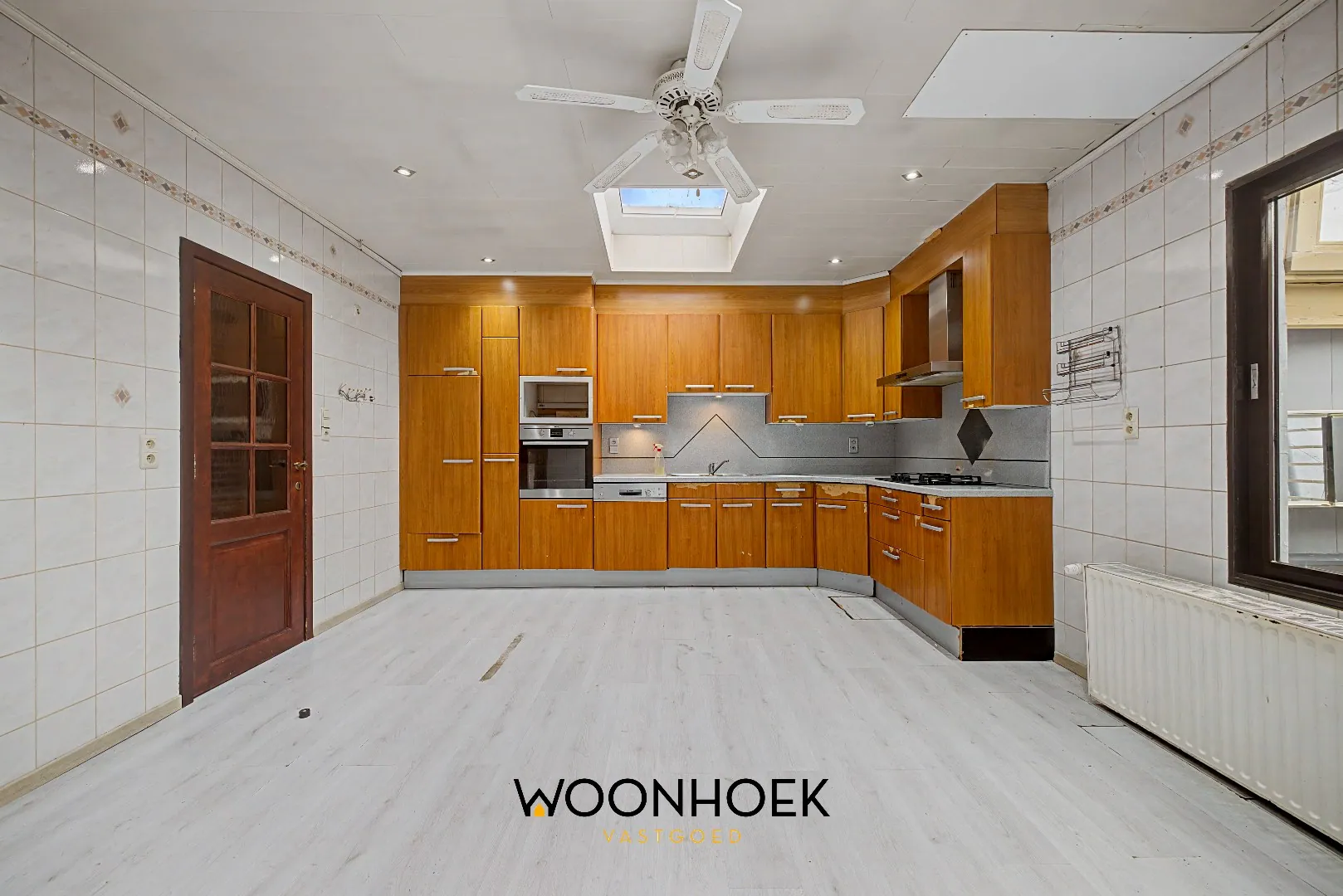 De inkomhal leidt naar een aangename leefruimte waar de gevelbreedte van 6 meter zorgt voor een open, luchtig en licht gevoel. Aansluitend bevindt zich de ruime keuken, voorzien van bijzonder veel kastruimte en alle nodige toestellen. Dankzij de lichtkoepels baadt deze ruimte in natuurlijk daglicht.