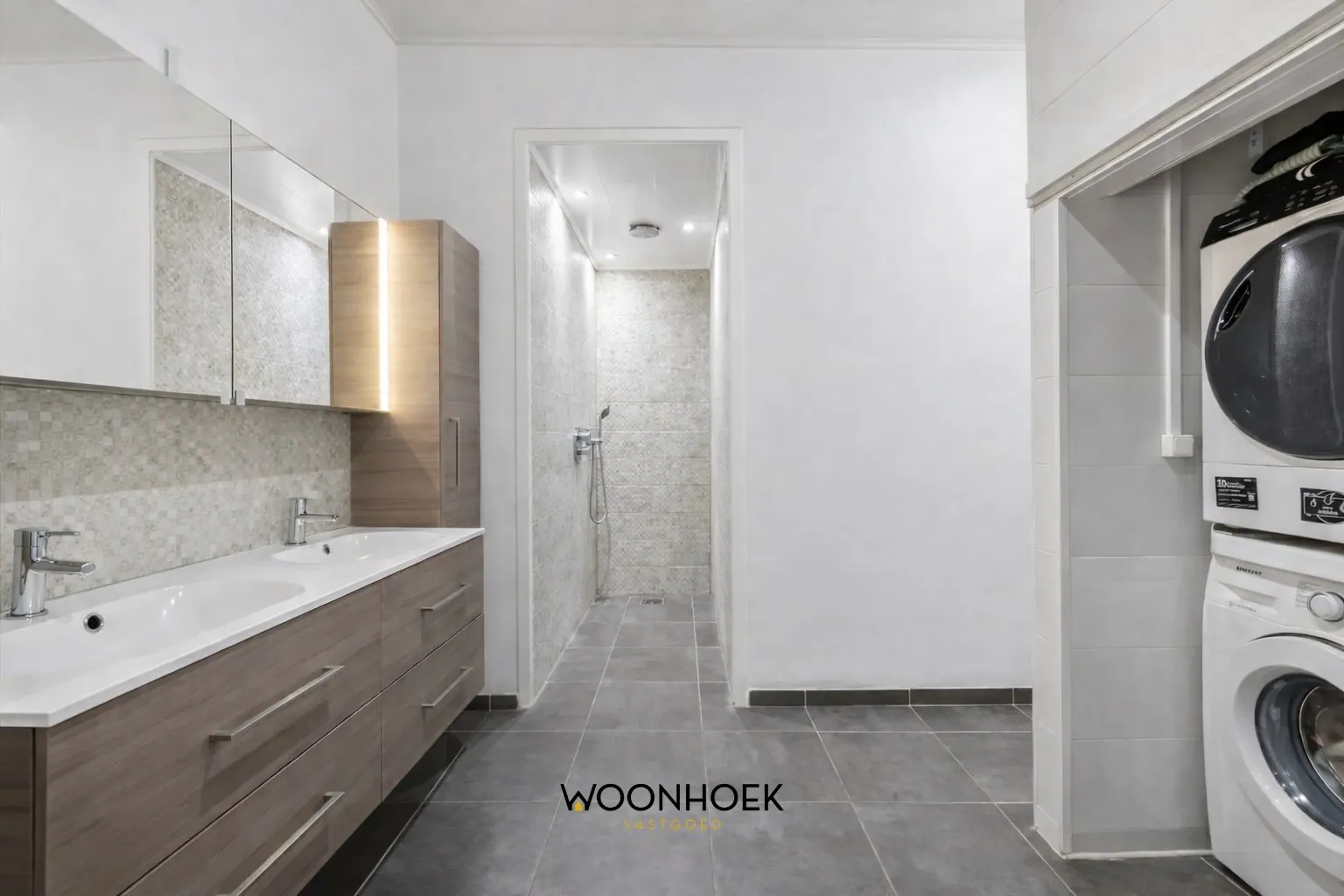 Verder vindt u op het gelijkvloers een ruime badkamer, uitgerust met inloopdouche, ligbad, toilet en een dubbele wastafel in meubel. Ook de aansluitingen voor wasmachine en droogkast zijn hier discreet geïntegreerd.