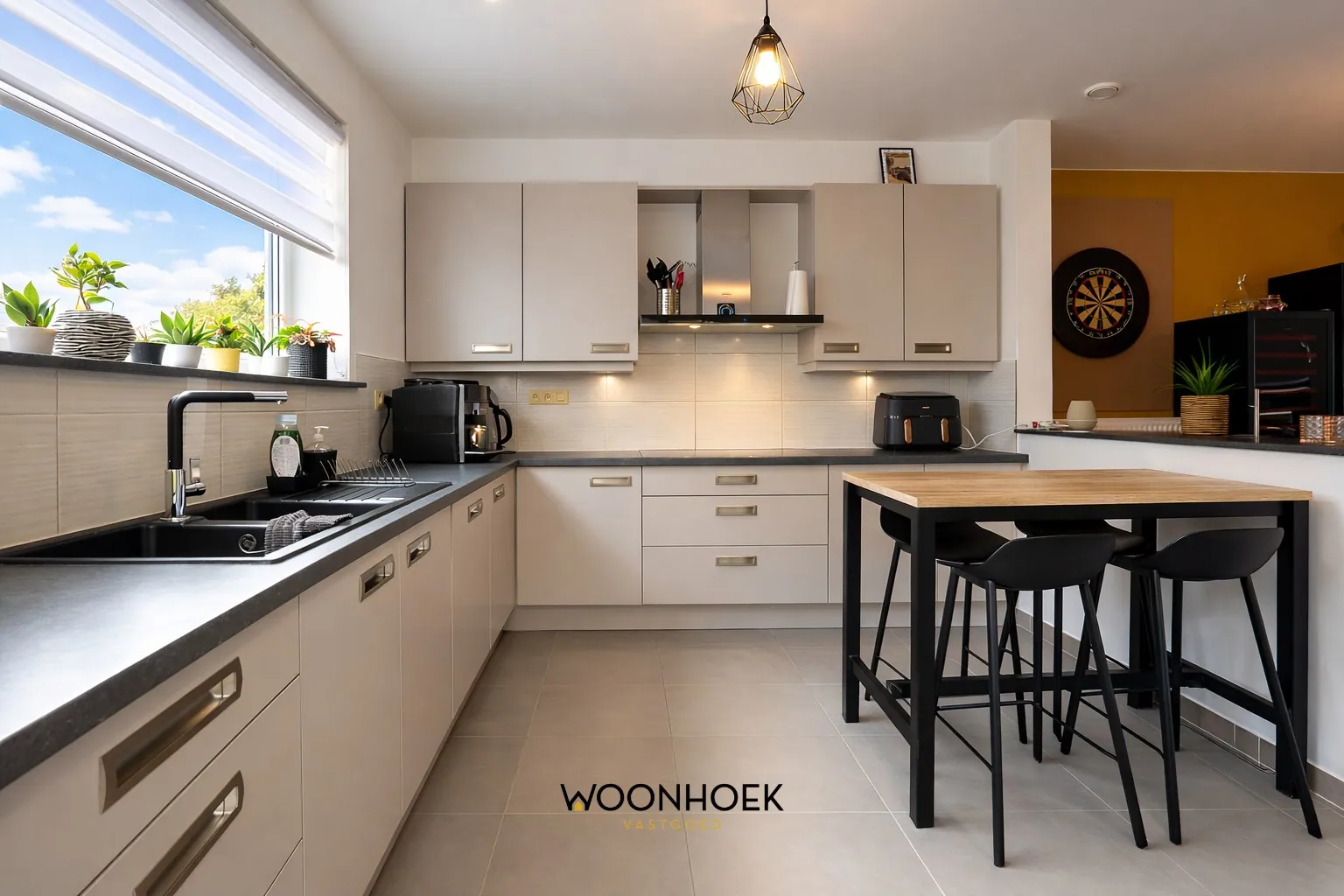 Bij het betreden van de woning wordt u verwelkomd in de inkomhal met apart gastentoilet. Vanuit hier bereikt u de lichtrijke leefruimte, die naadloos overvloeit in de halfopen keuken. Deze centrale leefzone vormt het hart van de woning en straalt een aangename, hedendaagse sfeer uit. Het zicht op de sfeervolle binnentuin creëert een mooie verbinding tussen binnen en buiten.