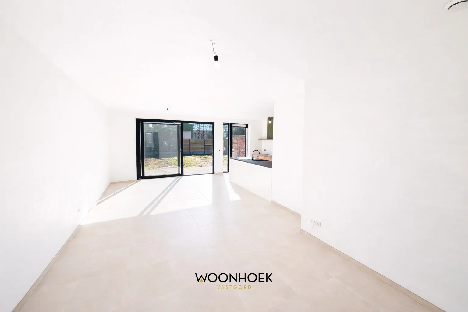 Achteraan opent zich de lichtrijke leefruimte met vloerverwarming, elegant opgedeeld in een eet- en zithoek. Het grote schuifraam zorgt voor een overvloed aan natuurlijk licht en creëert een vloeiende overgang naar het terras en de tuin. De open keuken vormt het stijlvolle hart van de woning en kan nog volledig naar eigen smaak worden ingericht.