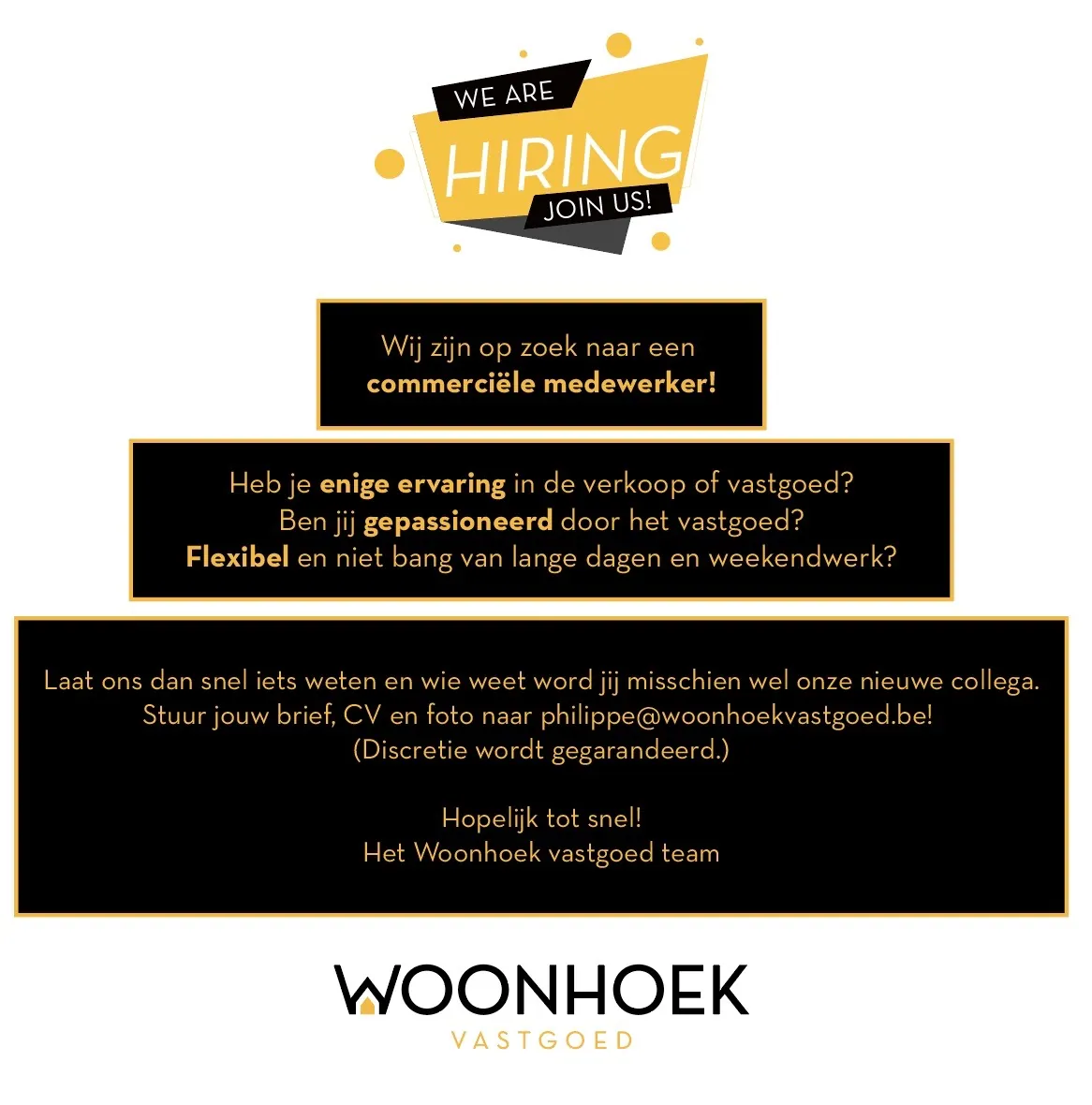 Ben jij een enthousiaste vastgoedmakelaar die op zoek is naar een nieuwe uitdaging? Wil jij je aansluiten bij ons succesvolle vastgoedkantoor met regionale bekendheid? Bij WOONHOEK vastgoed zijn we op zoek naar een makelaar met een positieve werkmentaliteit die ons topteam kan versterken! Als vastgoedmakelaar met een erkend BIV-certificaat of als vastgoedbediende krijg je bij ons de kans om je talenten te laten schitteren. In de bruisende regio Waasland en Denderstreek waar we ons kantoor willen uitbreiden, word jij verantwoordelijk voor de verkoop, prospectie van diverse woningen, appartementen en projecten.
