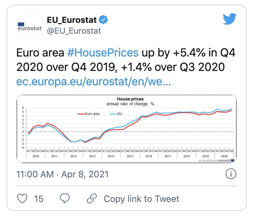 Een huis was eind 2020 in België 5,7 procent duurder dan het jaar voordien, berekende Eurostat. Dat is precies even veel als de gemiddelde prijsstijging in de hele Europese Unie, en ietsje meer dan het gemiddelde in de eurozone (+5,4 procent). De prijzen stegen het sterkst sinds 2006, aldus Eurostat.